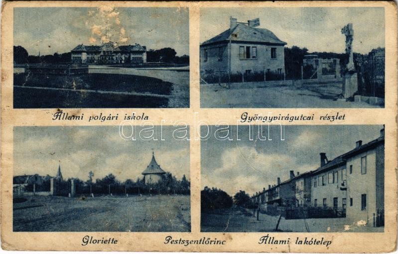 1932 Budapest XVIII. Pestszentlőrinc, Pusztaszentlőrinc, Szentlőrinc; Állami polgári iskola, Gyöngyvirág utcai részlet, üzlet, Gloriette, Állami lakótelep (EB)