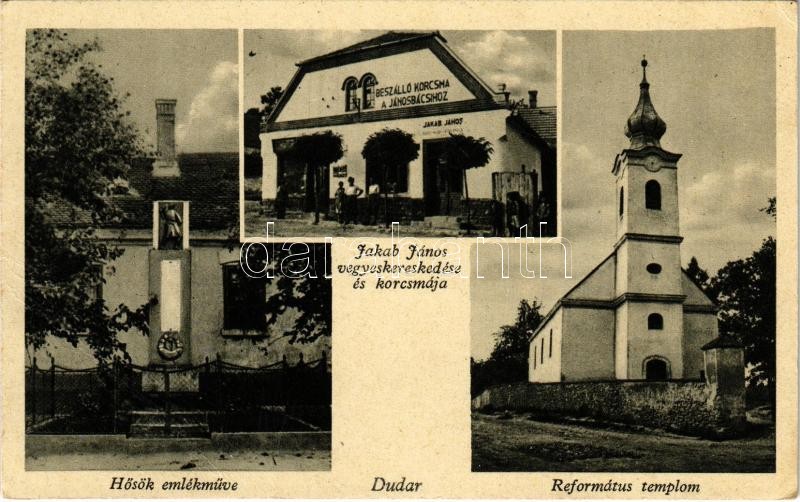 Beschreibung: 1944 Dudar, Hősök emlékműve, Református templom, Jakab János kocsmája a János bácsihoz, üzlete és saját kiadása (EK)