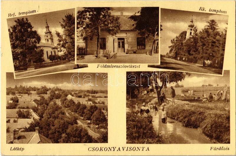 Beschreibung: Csokonyavisonta, Református templom, Földmívesszövetkezet üzlete, Római katolikus templom, fürdőzők a Györgyösi patakban, látkép
