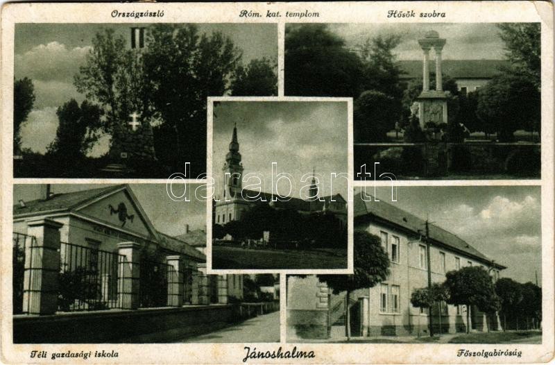 Beschreibung: Jánoshalma, Hősök szobra, országzászló, Római katolikus templom, téli gazdasági iskola főszolgabíróság (fa)
