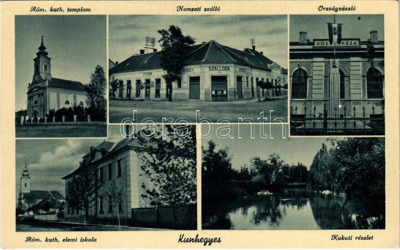 Kunhegyes, Római katolikus templom, Nemzeti szálloda és étterem, Országzászló, Községháza, Római katolikus elemi iskola, Kakati részlet. Özv. Dóczy Józsefné és Olga kiadása (EK)