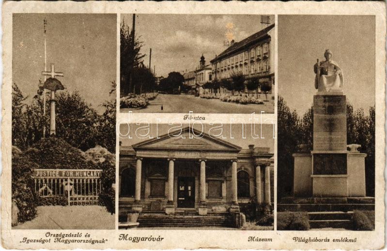 Beschreibung: Magyaróvár, Mosonmagyaróvár; Országzászló és "Igazságot Magyarországnak" irredenta propaganda, Fő utca, Múzeum, Világháborús emlékmű (EB)