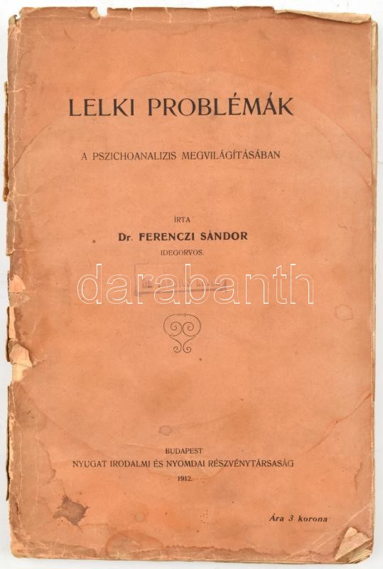 Dr. Ferenczy Sándor: Lelki problémák a pszcihoanalizis megvilágításában. Bp., 1912, a Nyugati Irodalmi és Nyomdai Részvénytársaság kiadása. Kiadói papírkötés, rossz állapotban,foltos, szétszakadt borító, szétvált kötéssel, kijáró lapok. Dienes István, régész aláírásával és Dr. Jaksics Lajos orvos pecsétjével.