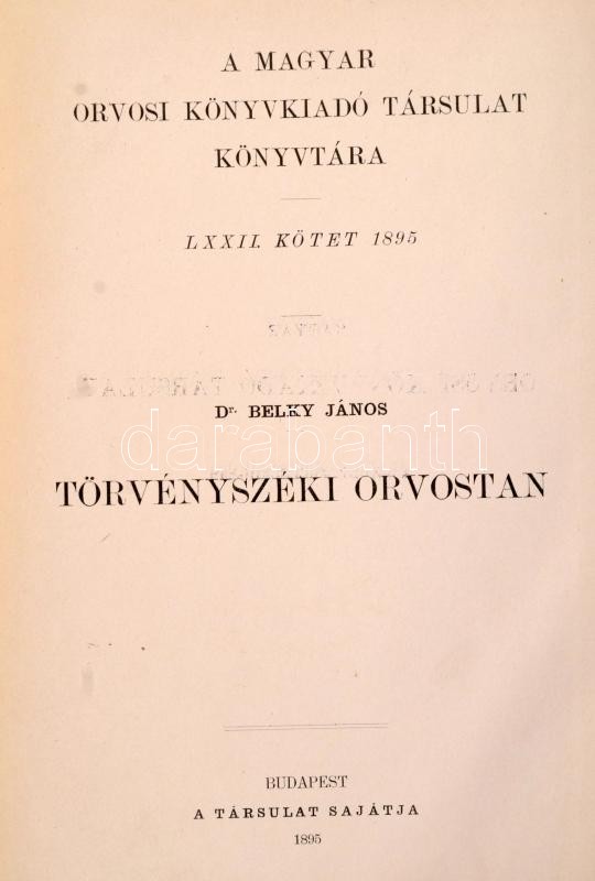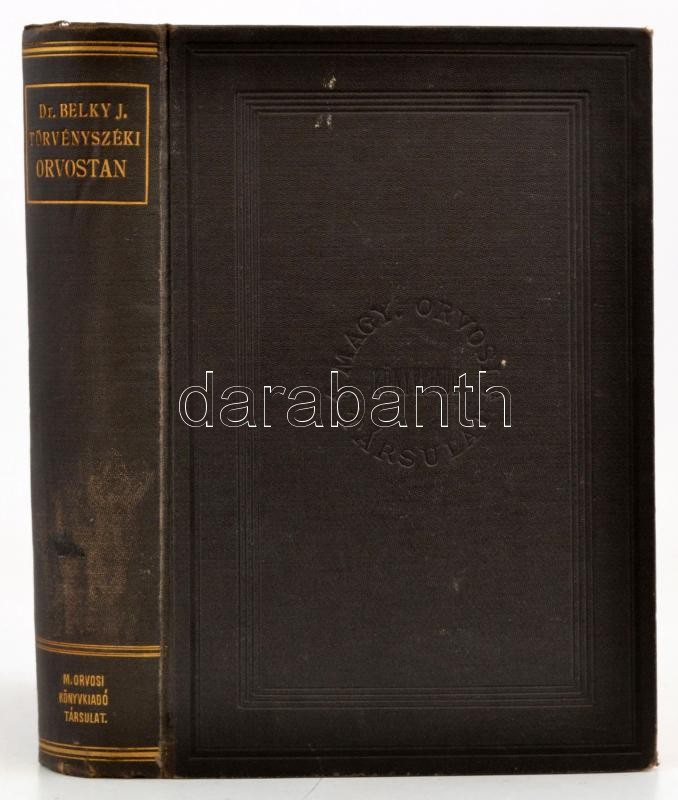 Belky János: Törvényszéki orvostan. A holttest jelenségeiről és a személyazonosságról szóló részt kidolgozta: Dr. Genersich Antal. Magyar Orvosi Könyvkiadó-Társulat Könyvtára LXXII kötet. Bp., 1895., Magyar Orvosi Könyvkiadó Társulat, X+736 p. Szövegközti illusztrációkkal. Kiadói aranyozott egészvászon-kötés, Gottermayer-kötés, hiányzó szennylapokkal, intézményi bélyegzőkkel, két lapon ceruzás bejelöléssel.