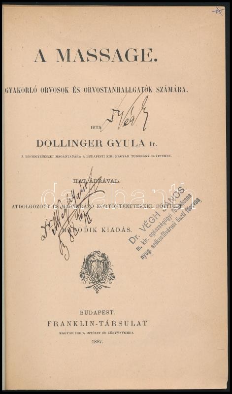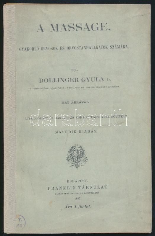 Dollinger Gyula: A massage. Gyakorló orvosok számára. Bp., 1887., Franklin, VIII+127 p.+ 6 t. (fekete-fehér képtáblák.) Átdolgozott és magyarázó kórtörténetekkel bővített második kiadás. Kiadói papírborítókkal, megerősített gerinccel, intézményi bélyegzőkkel, egyébként jó állapotban. Dr. Dollinger Gyula (1849-1937) orvos, egyetemi tanár, a magyar ortopédia kiemelkedő alakja és megalapozója, 1882-ben testegyenészeti (ortopédia) magántanári képesítést szerzett. Masszázs szakirodalom! Ritka! Dr. Végh János m. kir. egészségügyi főtanácsos, ny. székesfővárosi tiszti főorvos névbejegyzéseivel, és névbélyegzőjével.