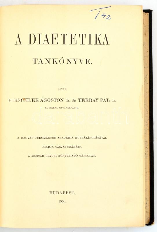Hirschler Ágoston-Terray Pál: A diaetetika tankönyve. Magyar Orvosi Könyvkiadó-Társulat Könyvtára LXXXII kötet. Bp., 1900., Magyar Orvosi Könyvkiadó Társulat, XVI+2+630+2 p. 1 t. Kiadói aranyozott egészvászon-kötés, Gottermayer-kötés, a gerincen kis folttal és kis sérüléssel, de alapvetően jó állapotban.