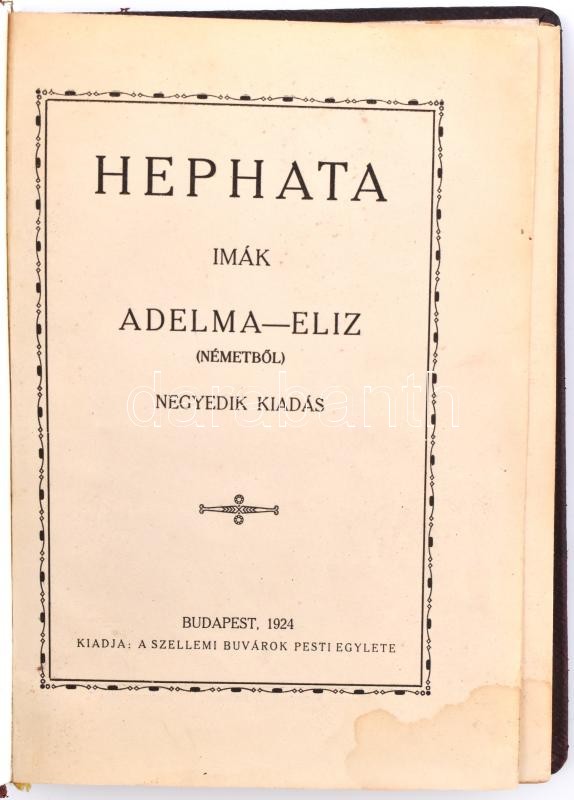 Beschreibung: Adelma-Eliz: Hephata. Imák. Bp., 1924., a Szellemi Buvárok Pesti Egyletének kiadása, negyedik kiadás, bőrkötéses, kopott, foltos lapok és borító