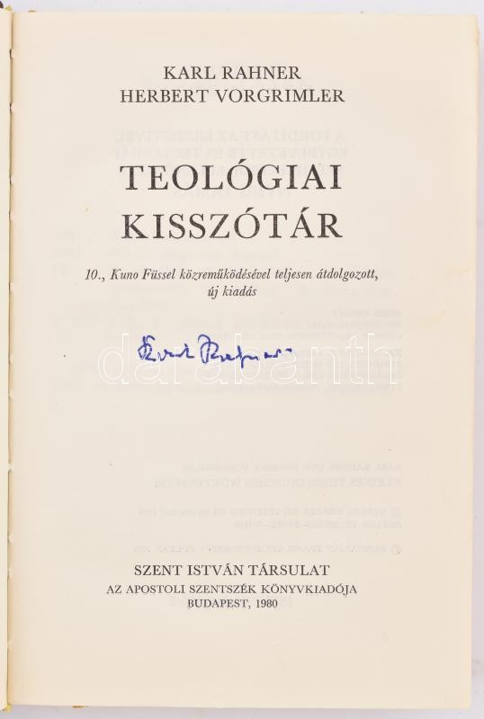 Az egyik szerző, Karl Rahner (1904-1984) teológus, filozófus, jezsuita szerzetes által aláírt, dátumozott példány.
