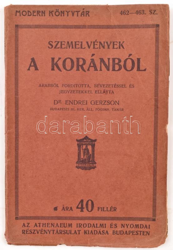 Szemelvények a Koránból. Fordította és kiegészítette Dr. Endrei Gerzson. hn., én., az Athenaeum R. T. kiadása. Modern Könyvtár, 462-463. sz. Kiadói papírkötés. Kissé szakadozott, laza kötésű, tulajdonosi névbejegyzéssel.