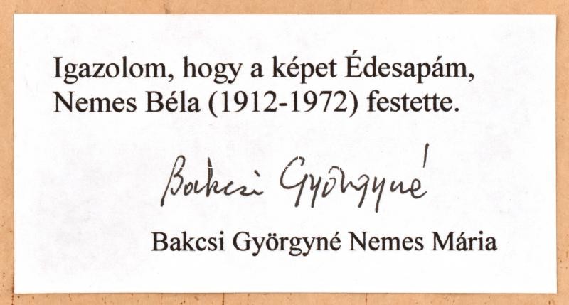 Beschreibung: Nemes Béla (1912-1972): Zöldellő táj. Olaj, karton, jelzés nélkül, hátoldalán a művész lánya eredetiség igazolásával, kopott fa keretben, 50x35 cm
