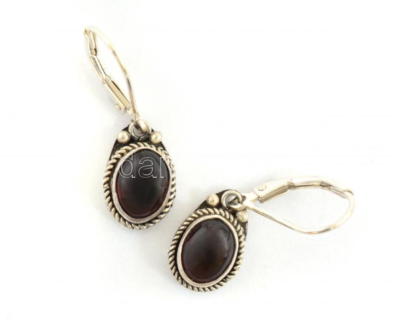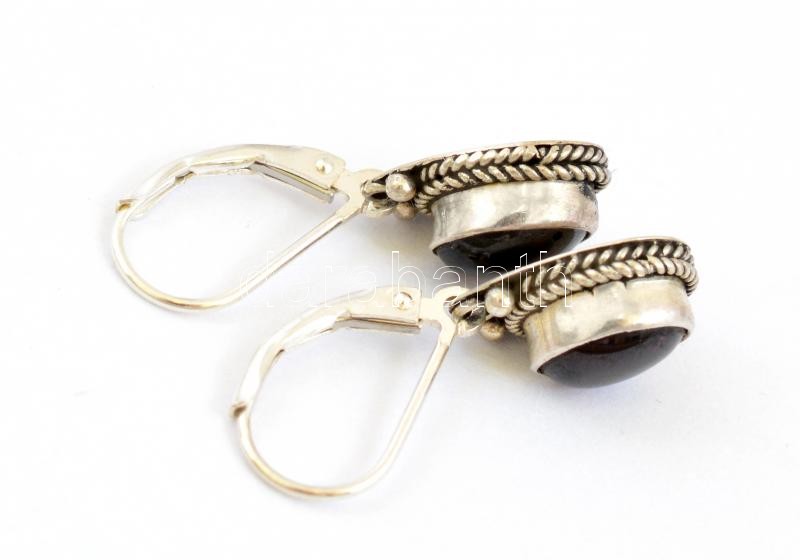 Beschreibung: Ezüst(Ag) gránát kővel foglalt filigrán díszítésű fülbevalópár, jelzett, 2,7x0,8 cm, bruttó: 3,57 g