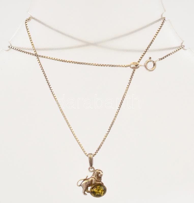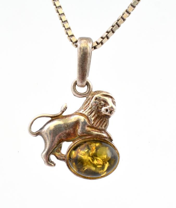 Ezüst(Ag) nyaklánc, oroszlános medállal, benne borostyán kővel, jelzett, h: 45 cm, medál: 1,5x1,5 cm, bruttó: 4,85 g