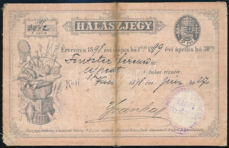 1898 Halászjegy megviselt állapotban https://www.darabanth.com/de/375-Fernauktion/375.0/Kunst-Dokumente-andere-Sammelgebiete/Dokument~500018/1898-Halaszjegy-megviselt-allapotban~II2194707