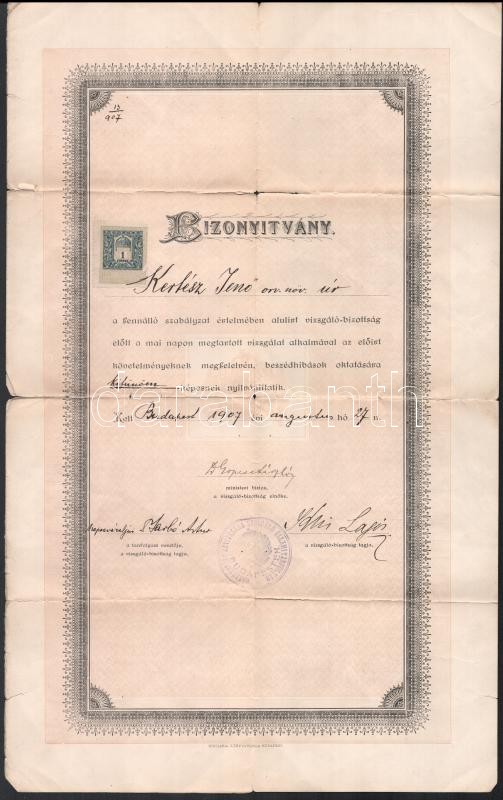 1907 Beszédhibák javítására szolgáló állami tanfolyam bizonyítvány. Sarbó Artúr (1867-1943) nemzetközi hírű ideggyógyász, a magyar logopédia iskolateremtő személyiségem tanfolyam vezető autográf aláírásával! 1 Korona illetékbélyeggel. Hajtásnyommal, szakadásokkal