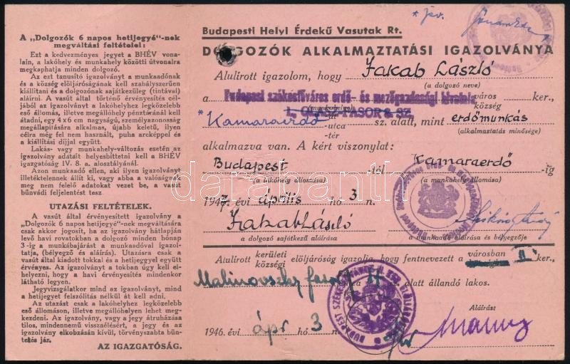 1947 A BHÉV dolgozók alkalmaztatási fényképes igazolványa a 6 napos hetijegy megváltásához Móricz Zsigmond körtér-Kamaraerdő viszonylatra, még pengős felirattal, kitöltve, pecsételve, szép állapotban, Jakab László erdőmunkás, korábbi M. kir. honvédezredes részére