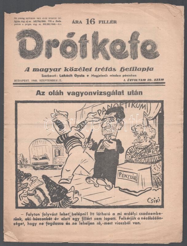 1940 szept. 27., Drótkefe, a Magyar közélet tréfás hetilapja (antiszemita élclap), többe közt az erdélyi bevonulással kapcsolatos karikatúrákkal, I. évfolyamának 29. száma, sérült