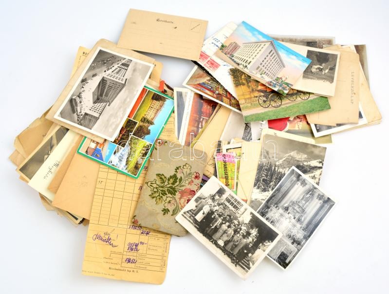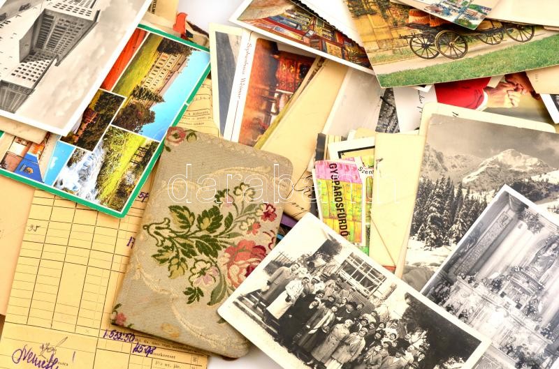 Beschreibung: Vegyes papírrégiség tétel, képeslapok, okmányok, igazolványok, régi levelek