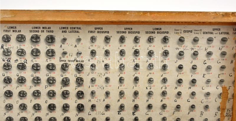 Régi fogorvosi készlet fogpótláshoz szükséges fém mintákkal, össz. 150 db, hiánytalan. Fa dobozban, fedél belsejére ragasztott angol nyelvű illusztrációval, rajta tollal írt kiegészítésekkel, doboz mérete: 5,5x18x27 cm