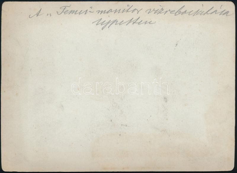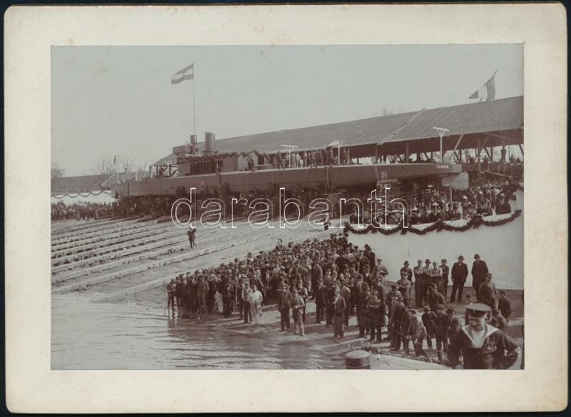 1904 Az SMS Temes, az Osztrák-Magyar Monarchia Haditengerészetének monitorhajójának vízre bocsátása Újpesten, Dunai Flottila, keményhátú fotó, hátulján feliratozott, 10,5x15 cm / SMS Temes, Austro-Hungarian Navy monitor ship, setting afloat at Újpest, Danube Fleet, photo, labelled on the back