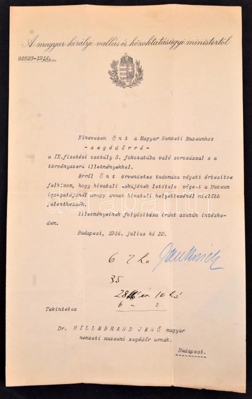 Beschreibung: 1914 Nemzeti Múzeumba segédőri kinevezés Jankovich Béla vallás- és közoktatásügyi miniszter aláírásával