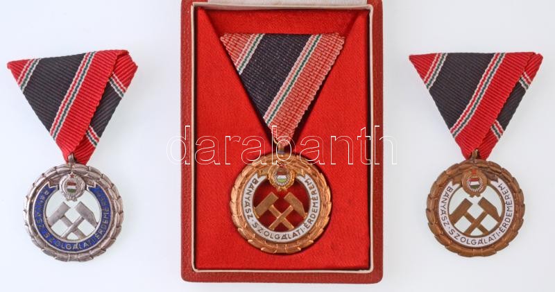 Beschreibung: 1957. "Magyar Népköztársaság Bányász Szolgálati Érdemérem arany fokozata" aranyozott, zománcozott Br kitüntetés mellszalagon, eredeti tokban + "Magyar Népköztársaság Bányász Szolgálati Érdemérem ezüst fokozata" ezüstözött, zománcozott Br kitüntetés mellszalagon + "Magyar Népköztársaság Bányász Szolgálati Érdemérem bronz fokozata" zománcozott Br kitüntetés mellszalagon T:1-2
