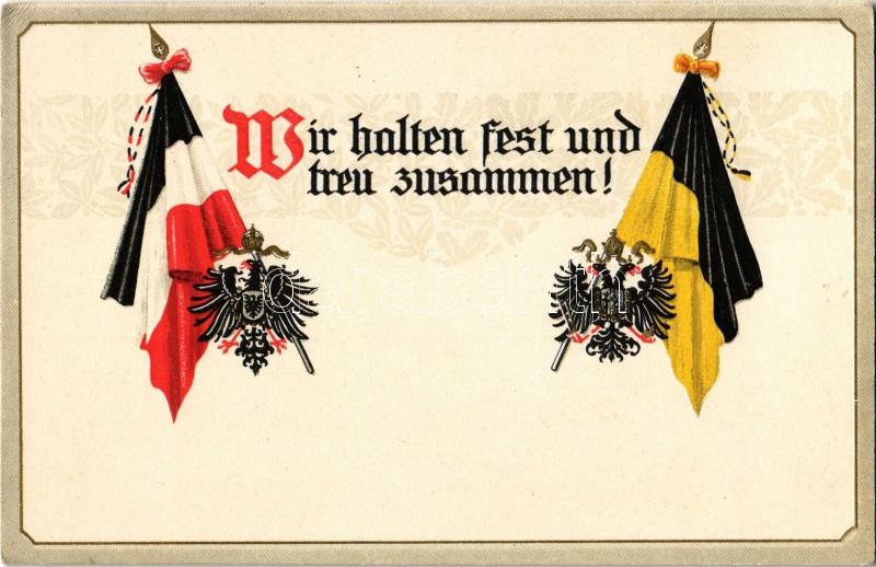 Beschreibung: Wir halten fest und treu zusammen! / WWI German flags. Erika Emb. litho