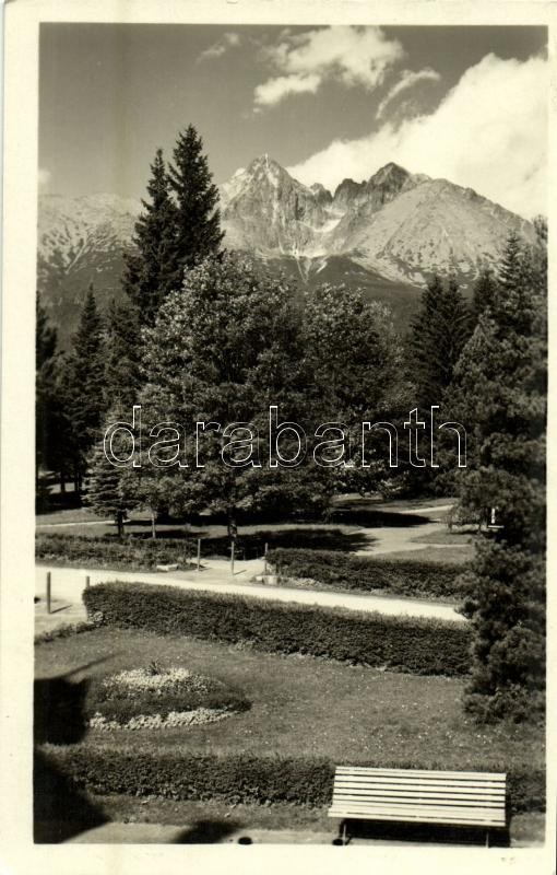 Tátralomnic, Tatranská Lomnica (Tátra, Magas Tátra, Vysoké Tatry); Park v pozadi Lomnicky a Kezmarsky stit / park, háttérben a Lomnici- és a Késmárki-csúcs / park, mountain peaks