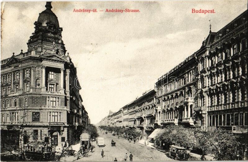 1909 Budapest VI. Andrássy út, villamos, lóvasút, földalatti vasúti megállóhely, Takarékpénztár, Fonciere Pesti Biztosító Intézet, fogorvosi rendelő, üzletek (EB)