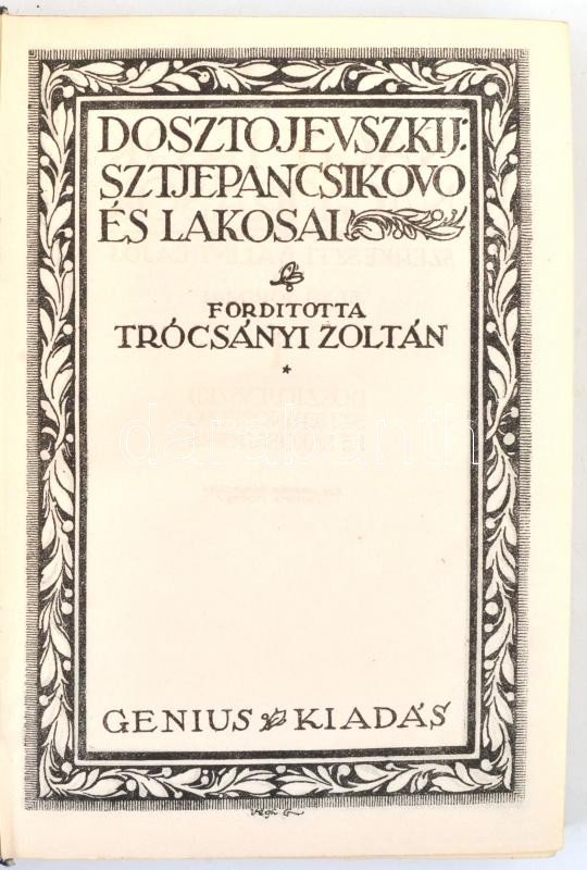 [Fjodor Mihajlovics] Dosztojevszkij: Sztjepancsikovo és lakosai. Ford.: Trócsányi Zoltán. Nagy Írók-Nagy Írások. Első sorozat. I. Bp.,(1920.), Genius, (Weiss L. és F.-ny.), XII+302+4 p. A címlap és a könyvdíszek Végh Gusztáv grafikus, iparművész munkái. A kötésterv Gottermayer Nándor terve. Kiadói fénylemez-kötésben, jó állapotban.
