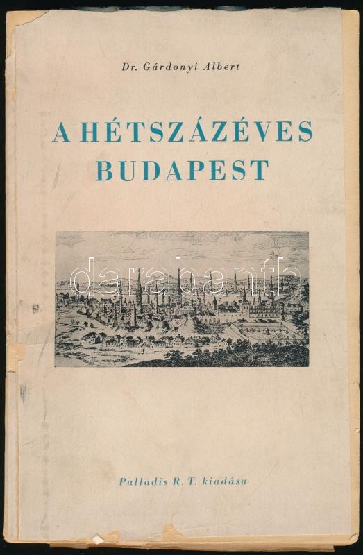 Dr. Gárdonyi Albert: A hétszázéves Budapest. Bp.,[1944], Palladis, 132 p. + 7 (fekete-fehér képtáblák) t. Kiadói papírkötés, az elülső borítót körbevágták, az hátsó borító levált.