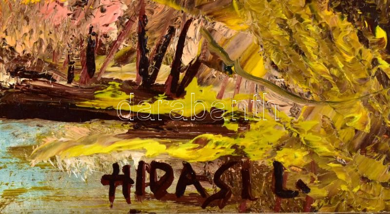 Beschreibung: Hidasi L jelzéssel: Tanya gémeskúttal. Olaj, farost, fa keretben, 15×20 cm