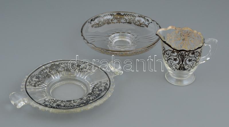 Beschreibung: 3 db-os fekete virágmintás üveg szett, tálkával, kínálóval, kiöntővel, kopásokkal, d: 16 cm, m: 9 cm