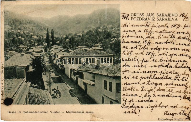 1907 Sarajevo, Gasse im mohamedanischen Viertel / Muslimanski sokak / ... https://www.darabanth.com/de/377-Fernauktion/377.0/Ansichtskarten/Bosnien-und-Herzegowina~2000022/1907-Sarajevo-Gasse-im-mohamedanischen-Viertel-Muslimanski-sokak-Muslim-quarter-street-EK~II2151842