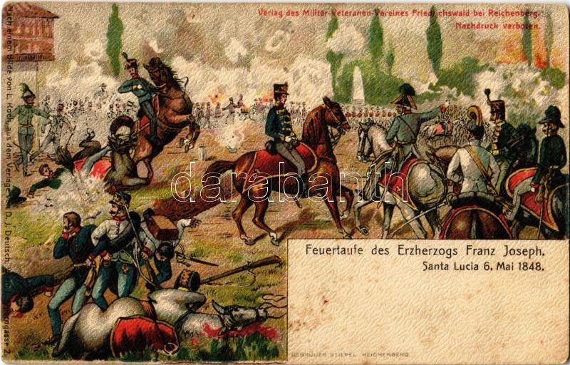 Feuertafe des Erzherzogs Franz Joseph. Santa Lucia 6. Mai 1848. Verlag des Militär-Veteranen-Vereines Friedrichswald bei Reichenberg / Battle of Santa Lucia. Franz Joseph (then only 17 years old) assisted at the battle. Gebrüder Stiepel. litho s: L. Koch (fl)