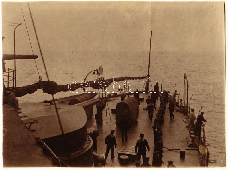 Az Osztrák-Magyar Haditengerészet csatahajója matrózokkal a fedélzeten. Lapra ragasztott fotó / K.u.K. Kriegsmarine / WWI Austro-Hungarian Navy battleship deck, mariners on board. photo glued to paper (vágott / cut)
