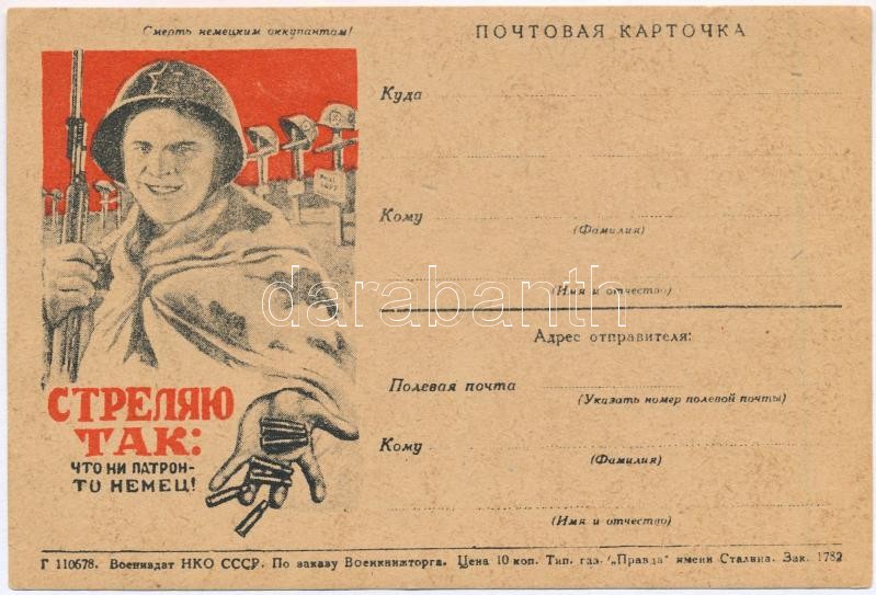 WWII "Death to the German invaders!" Russian military field ... https://www.darabanth.com/de/377-Fernauktion/377.0/Ansichtskarten/Militaria~2000082/WWII-Death-to-the-German-invaders-Russian-military-field-postcard-Red-Army-military-propaganda-~II2220304