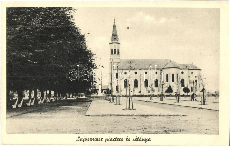 1943 Lajosmizse, Piac tér és sétány, templom https://www.darabanth.com/de/377-Fernauktion/377.0/Ansichtskarten/Ungarn~2000006/1943-Lajosmizse-Piac-ter-es-setany-templom~II1910642