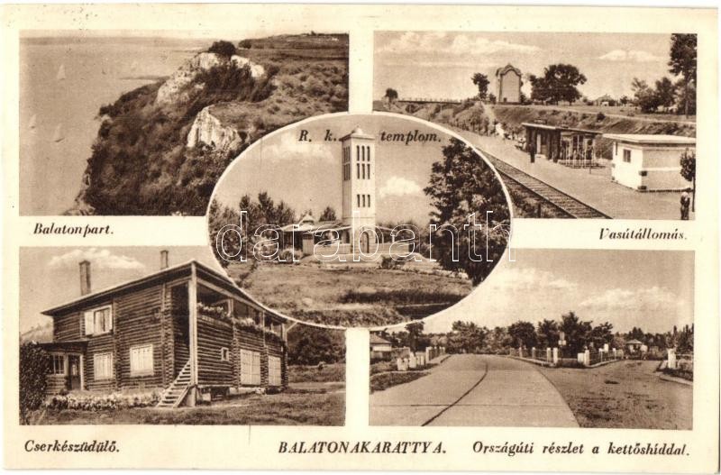 Balatonakarattya, Balaton part, vasútállomás, Római katolikus templom,... https://www.darabanth.com/de/377-Fernauktion/377.0/Ansichtskarten/Ungarn~2000006/Balatonakarattya-Balaton-part-vasutallomas-Romai-katolikus-templom-Cserkesz-udulo-OrszC3~II1910449