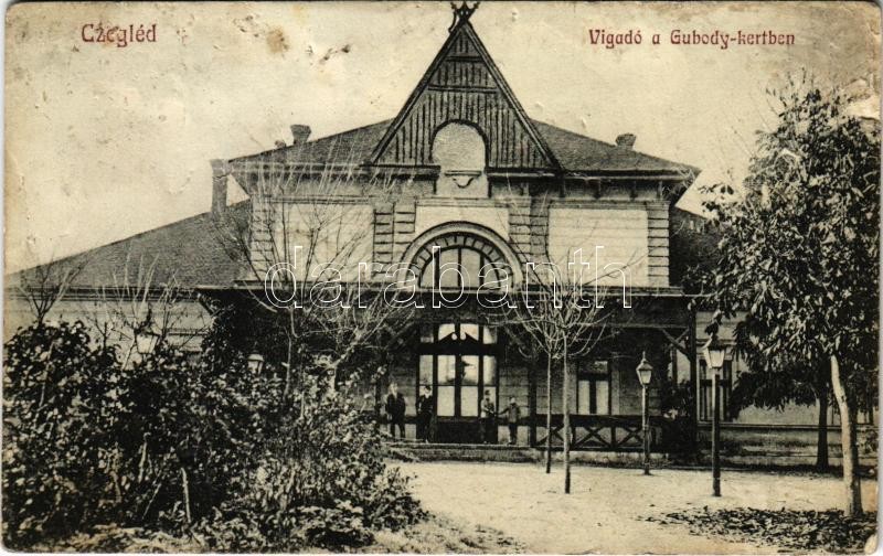 Cegléd, Vigadó a Gubody kertben (tűnyomok / pin marks) https://www.darabanth.com/de/377-Fernauktion/377.0/Ansichtskarten/Ungarn~2000006/Cegled-Vigado-a-Gubody-kertben-tunyomok-pin-marks~II2179155