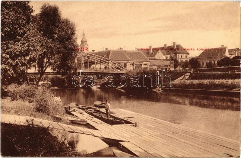 Beschreibung: Győr, Rába híd, kikötő csónakokkal. Réthy féle "Pemetefű cukorka köhögés ellen" reklám felirata elcsúszva a lap közepén