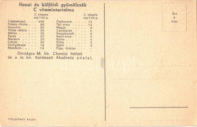Beschreibung: Magyar egészségügyi propaganda, C-vitamin táblázat a hátoldalon / Hungarian health campaign propaganda, Vitamin C chart s: Vöczköndy