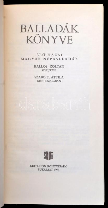 Kallós Zoltán: Balladák könyve. Élő hazai magyar népballadák. - - gyűjtése. Szabó T. Attila gondozásában. Bukarest, 1971, Kriterion. Magyar Helikon. Kiadói egészvászon kötés, jó állapotban.