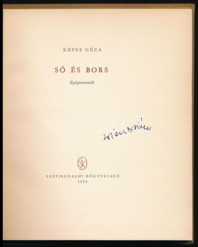 Képes Géza: Só és bors. Epigrammák. Bartha László rajzaival. Bp.,1956., Szépirodalmi. Első kiadás. Kiadói egészvászon-kötés. Megjelent 3000 példányban. Dienes István (1929-1995) régész, muzeológus névbejegyzésével.