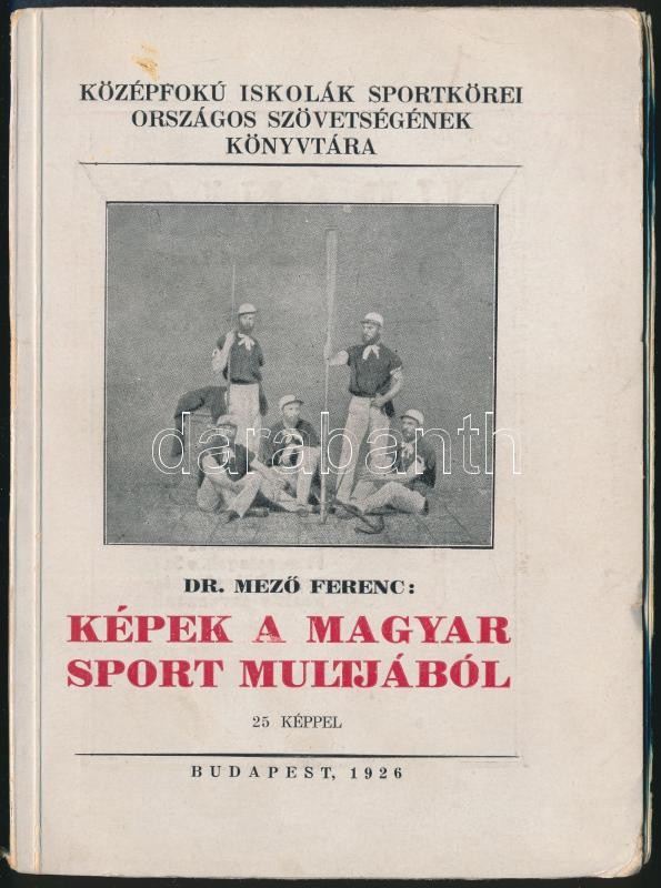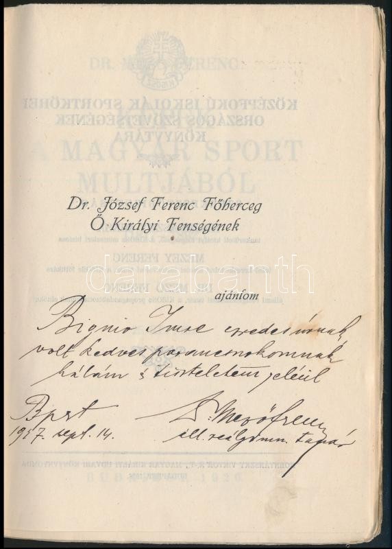dr. Mező Ferenc: Képek a magyar sport multjából 25 képpel. Dedikált "Bignio Imre ezredes úrnak, volt kedves parancsnokomnak..."Bp., 1926, Kiadói papírkötésben.