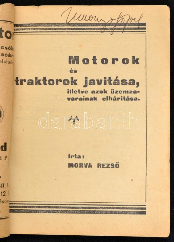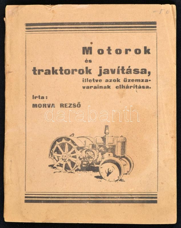 Morva Rezső: Motorok és traktorok javítása, illetve azok üzemzavarainak elhárítása. H.n., é.n. (1937), magánkiadás. Kiadói tűzött papírkötés. Több korabeli hirdetéssel. Tulajdonosi névbejegyzéssel, enyhén sérült borítóval. 60 p