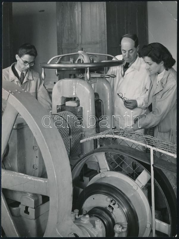 1953 Geleji Sándor (1898-1967) Kossuth-díjas professzor miskolci egyetemi hallgatói körében, gyakorlati oktatás közben gépek mellett, Vadas Ernő (1899-1962) fényképész vintage fotója, hátoldalon pecséttel jelzett, jobb felső sarkában töréssel, 12x8,5 cm