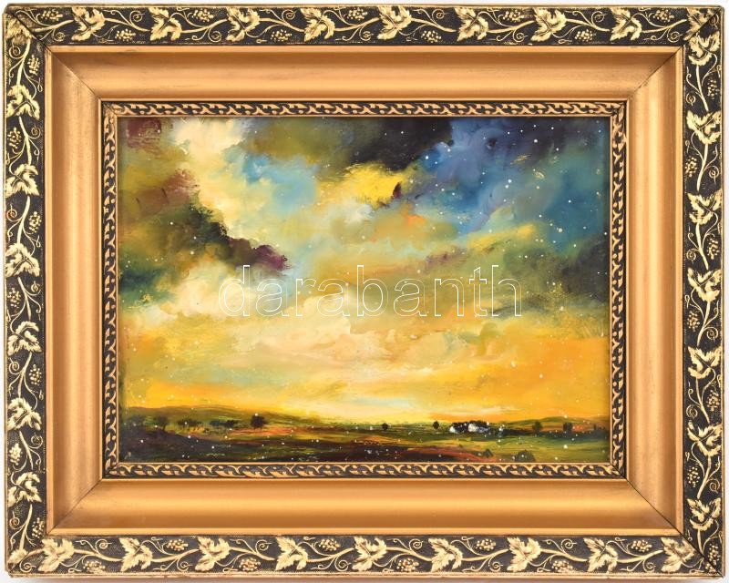 Beschreibung: Gábri/Gábry Albert (1935-2004): Alkony. Olaj, karton, jelzett, hátoldalán autográf felirattal. Díszes fa keretben, 25,5x36 cm.