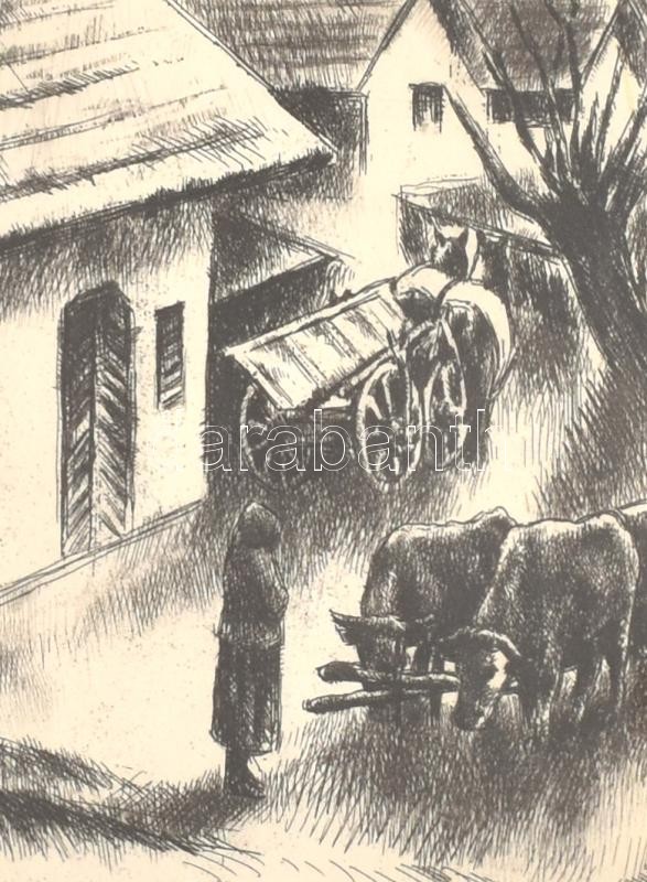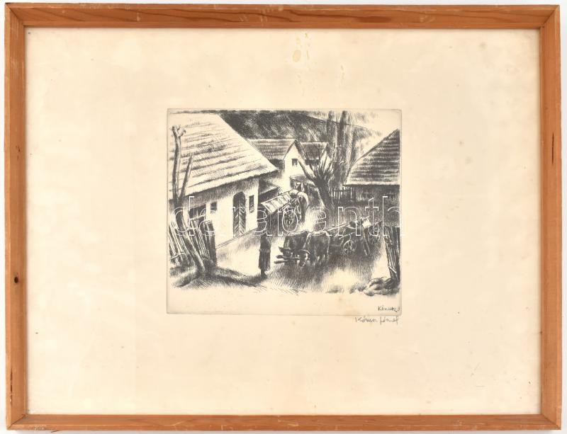 Beschreibung: Kórusz József (1927-2010): Udvar. Rézkarc, papír, kissé foltos, jelzett, üvegezett fa keretben, 22,5×27 cm