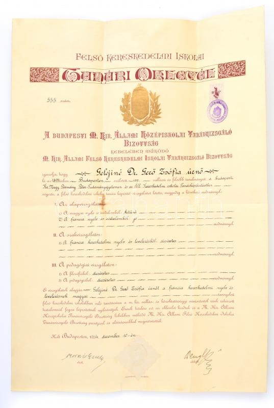 1934 Felső kereskedelmi iskolai tanári oklevél Gerő Zsófia (1895-1966) tanár, Gerő Ödön művészeti író (1863-1939) lánya részére, díszes fejléccel, szárazpecséttel, hajtásnyommal, közepén foltos és apró szakadással