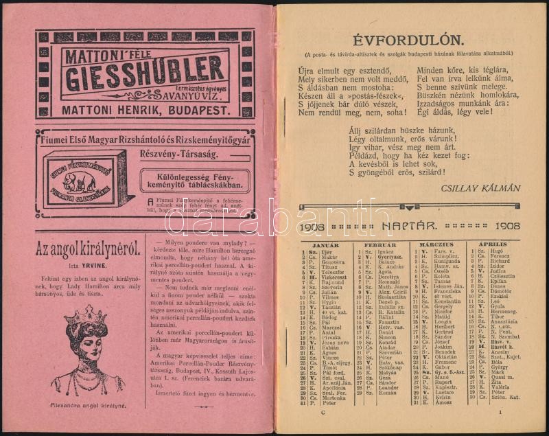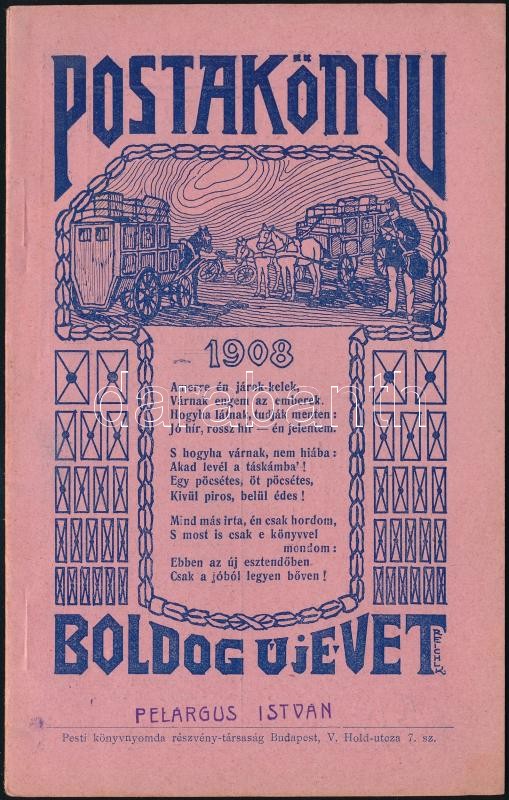 1908 Postakönyv. Bp., Pesti Könyvnyomda, korabeli reklámokkal, szecessziós borÃtóval, az utolsó lap és a borÃtó részben összeragadt, jelzett, a borÃtó Reichl Kálmán (1879-1926) épÃtész, festÅ‘, grafikus munkája, 24 p. Pelargus István m. kir levélhordó névbélyegzÅ‘jével.